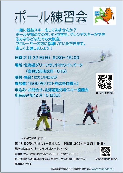 Top 第43回クラブ対抗スキー競技大会 2026.3.1 北海道グリーンランドホワイトパークスキー場 【 競技大会実施要綱 】 参加申込書 (クラブ取りまとめ用) 2026年2月7日 〆切(期日厳守) 一般参加者「参加申し込み」 ポール練習会を開催します。どなたでも参加出来ます。 2月22日(日) グリーンランドホワイトパーク 練習会 参加申し込みメールフォーム