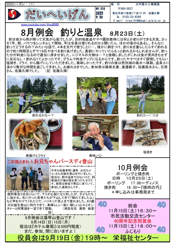 「スポーツする権利」を主張しながら「スポーツ、君が主人公」、「スポーツは平和とともに」のスローガンを掲げてクラブ活動をすすめています。創立時14名だったクラブ員も現在は総勢44名、指導員16名(上1、中7、初8)になりました。 日曜日・祝日の殆んどを例会として、十勝管内のスキー場や少し遠出して富良野やトマムで行なっています。例会回数を増やしたことで、参加可能な日を選んで自由に参加できると好評です。例会では、ワンポイントレッスンやゲレンデ巡り、その時々の雪質条件で達成感を味わっています。また、十勝管内には温泉が多く、例会後の例会参加者の意向で入浴セットということもあります。シーズン例会は15〜20回、最近は平日例会も計画中でさらに回数が増えそうです。また、雪が沢山あるスキー場(ニセコやキロロ、ルスツなど)に二泊三日ツアーをしたり、1日目比布、2日目カムイ、3日目富良野とスキー場をハシゴしたこともありました。 3月の上旬の土日は、糠平温泉スキー場を利用して「十勝スキーフェスティバル」を22回行ってきました。クラブ主体なので参加者は多くて30数名が最高ですが、温泉旅館を貸切にして、スキーはもちろん夜のお楽しみ交流会には、ずら〜っと並ぶ日本酒の種類は圧巻です。利き酒をして喜び・・・スキー談義に花を添える特効薬となっています。 毎年4月29日、富良野で行なう春スキーはいつの頃からか焼肉セットとなりました。当初はこじんまりと小さなコンロでのジンギスカンでしたが、最近は大きなコンロで炭火をおこし雨が降ろうが槍が降ろうがお構いなし、テントを張る大掛かりな焼肉パーティー。道具の用意など、準備は大変ですが、参加者の喜ぶ顔をみて満足しています オフシーズンは最低月一回の例会を企画しています。自然散策、パークゴルフ、登山、ボウリング、飲み会、グレスデンスキー、ハイキング、地域のお祭り(ワイン祭り等)参加、キャンプなどです。一年を通して月一回は役員会を開き、クラブの行事を計画・運営しています。また、例会の内容が伝わるよう写真を沢山載せた「だいへいげん通信」を適宜発行(メール配布、一部郵送)し、クラブと会員の動脈となっています。 |